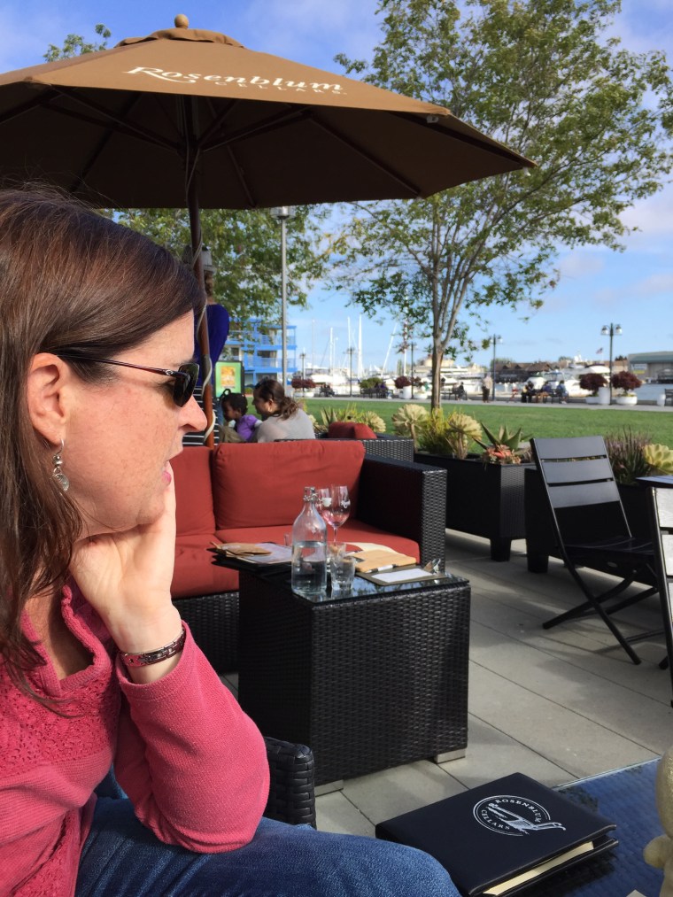 We ended up beating the fog across the bay and were able to enjoy almost another hour of sunshine in Jack London square. There is a wine tasting room right next to the doc were the ferry lets you off and my dad and Stephanie are members and had a case to pick up, so we stopped in for some tasting (Ziva enjoyed a tasting from the boobie bar while I enjoyed some tasty water). Surprisingly, we weren’t the only group with babies enjoying some wine and sunshine that afternoon on the patio of Rosenblum Cellars tasting room, there was what looked like a mom and baby group a few tables away too!