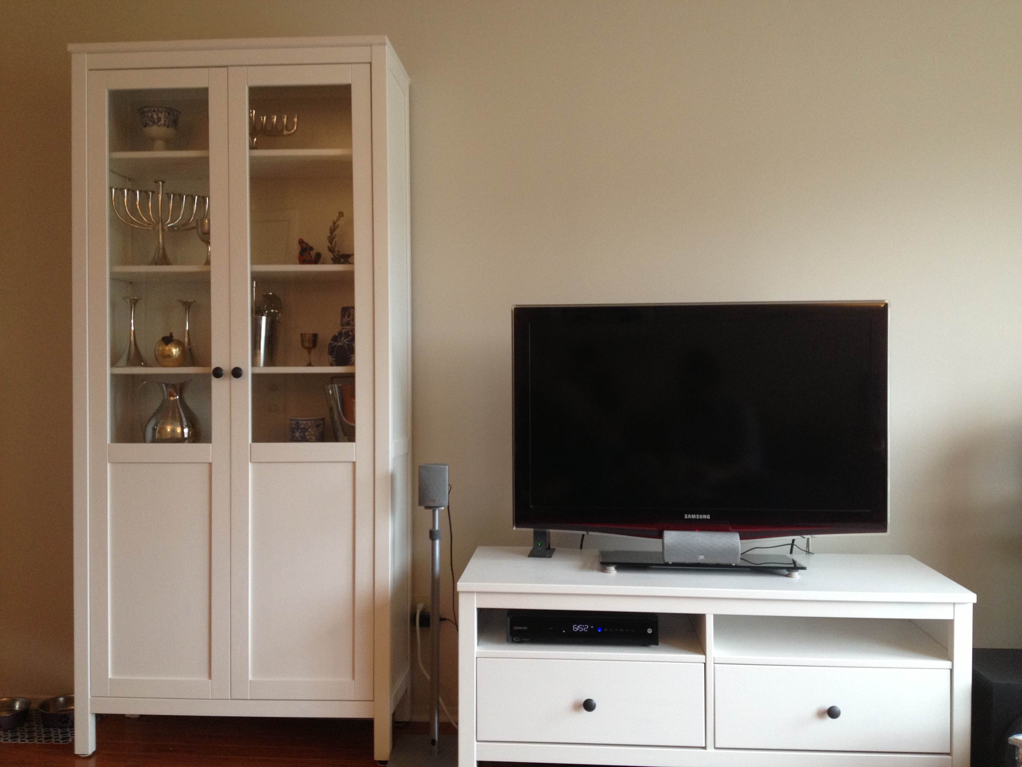 We went with the Hemnes Living rooms series. This is the 2 drawer version of the tv stand. The cabinet options were many and we took forever choosing this beauty with a big space at the bottom for hiding kitchen equipment until we have a bigger kitchen.